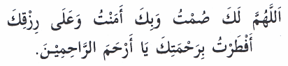 [Sebutan dalam rumi] Allahumma laka shumtu wa bika amantu wa‘alaa rizqika afthartu birahmatika yaa arhamarroohimiin