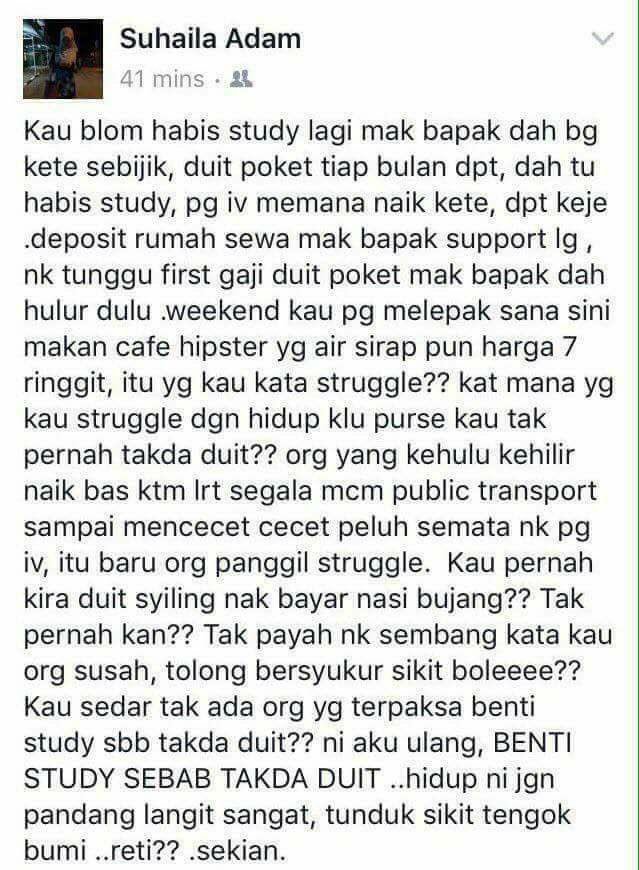 | 'Baru study mak bapak bagi kereta dan duit poket setiap bulan, itu kau kata struggle?' |